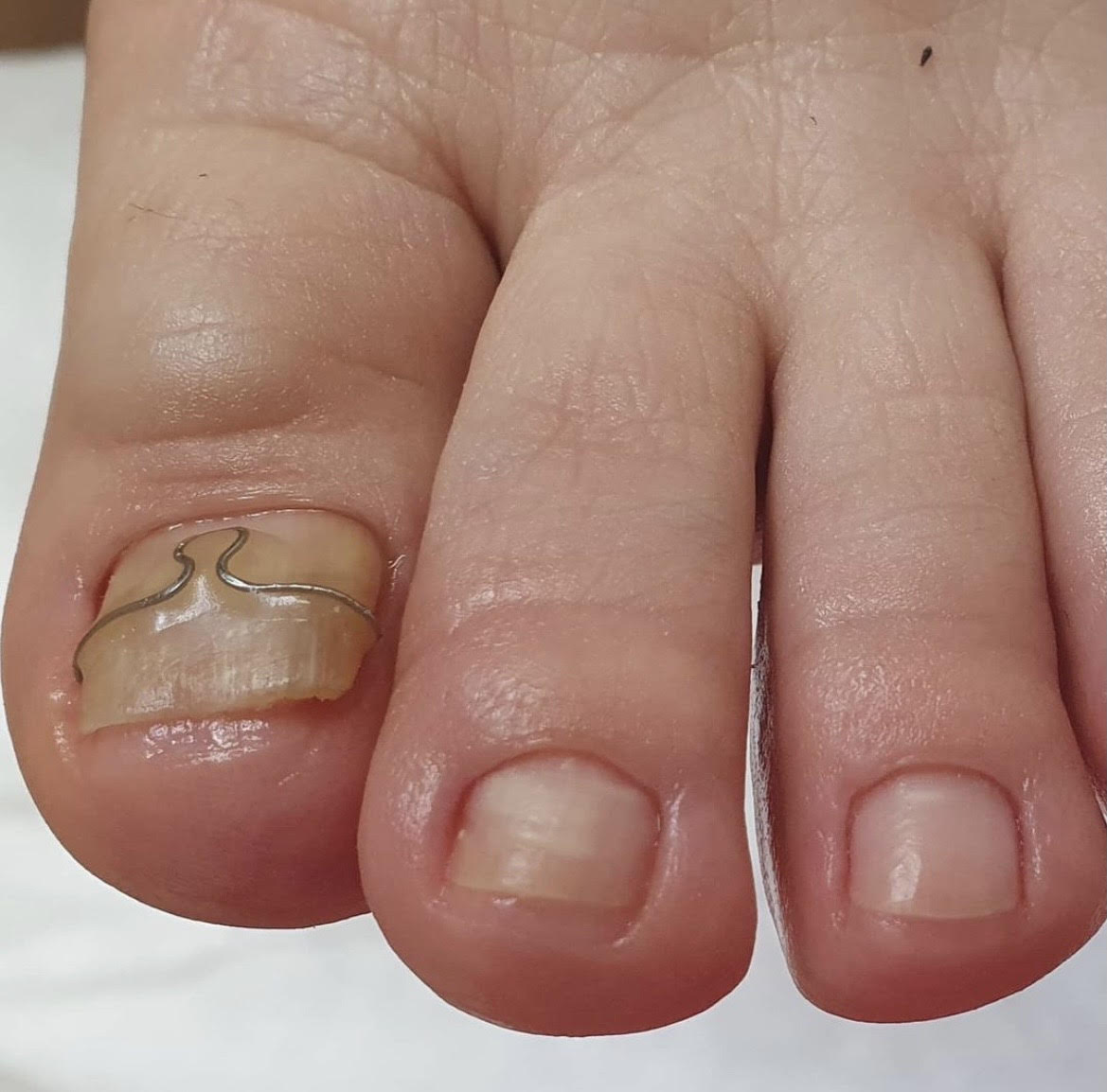 - L’orthonyxie : une correction de la courbure de l’ongle à l’aide d’un fil ou d’un ressort posé sur la plaque unguéale, afin de prévenir ou traiter l’ongle incarné.